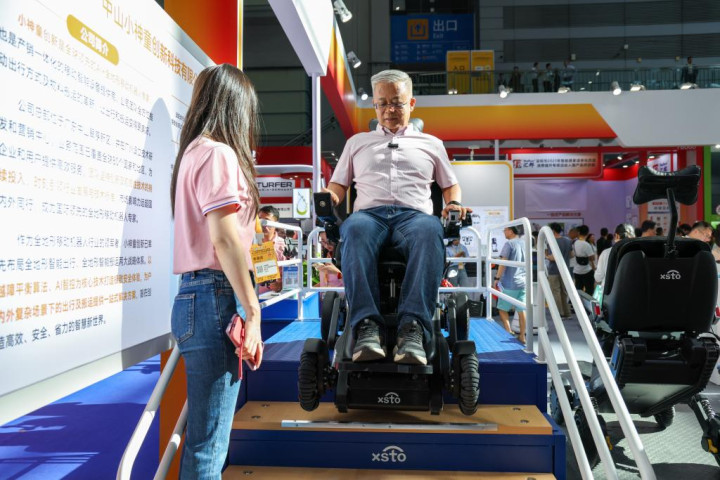 9月12日,观众在国际智慧养老产业博览会现场体验智能出行机器人。新华社记者梁旭摄